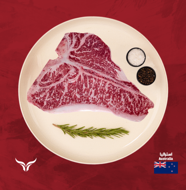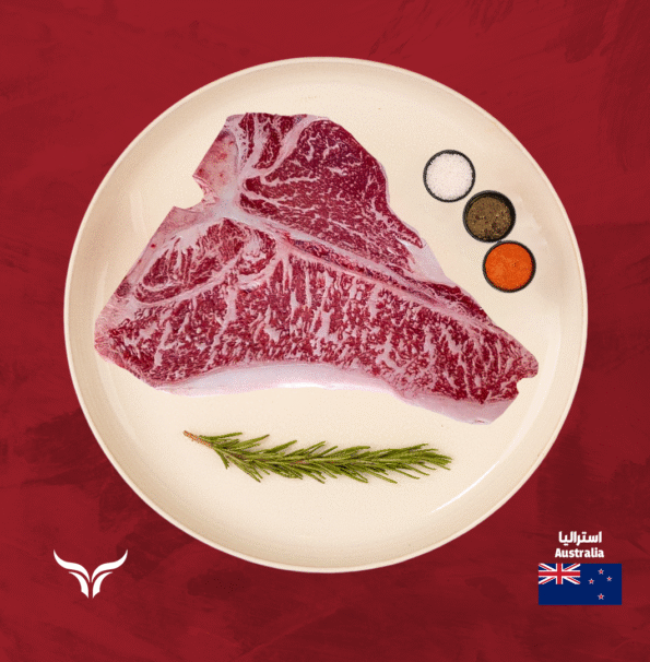 A premium steak combining tenderloin and striploin on a T-bone. 6/7 marbling results in a juicy, buttery flavor with a tender texture that maintains its tenderness during cooking. Sourced from a reliable Australian source and slaughtered in accordance with Islamic law, the meat is vacuum-packed to retain juices and freshness.
