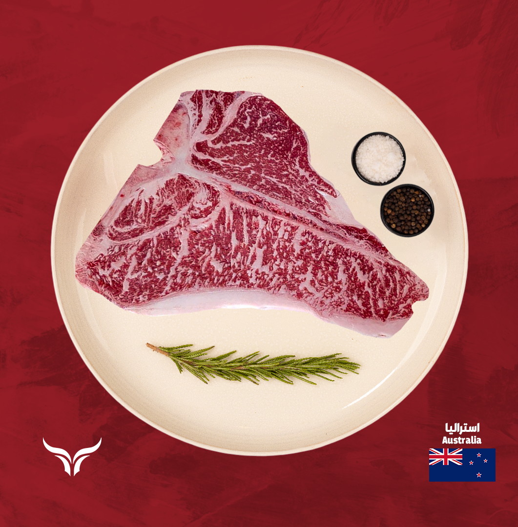 Originating in Australia, the Wagyu breed is highly marbling (6/7), and the T-bone cuts include fillet and strip steak on the bone. The ideal thickness for a steak is between three and four centimeters, and it is available in approximate weights, typically ranging from 400 to 700 grams per steak, depending on the actual cut.