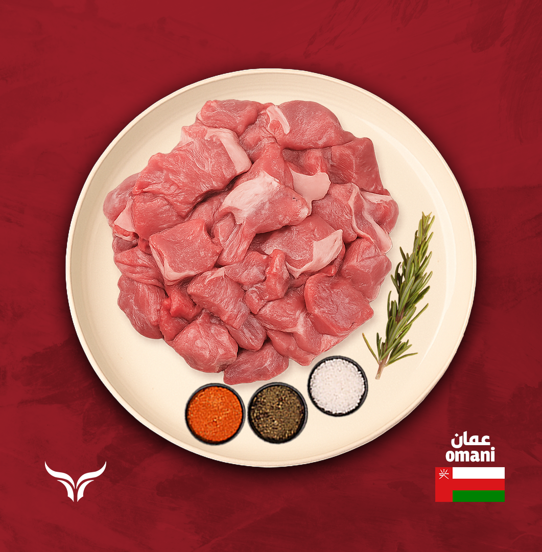 مكعبات لحم جمل محلي من سلطنة عُمان بدون عظم بطابع لحمي نظيف ونكهة خفيفة مائلة للحلاوة، مُعبّأة بتقنية الفاكيوم للحفاظ على الطزاجة والعصارة، ومناسبة للسالونة والمجبوس واليخنات والكاري وللشوي بعد التتبيل الجيد، ومتوافرة عادةً بأوزان 500 جم و1 كجم بحسب التوفر.